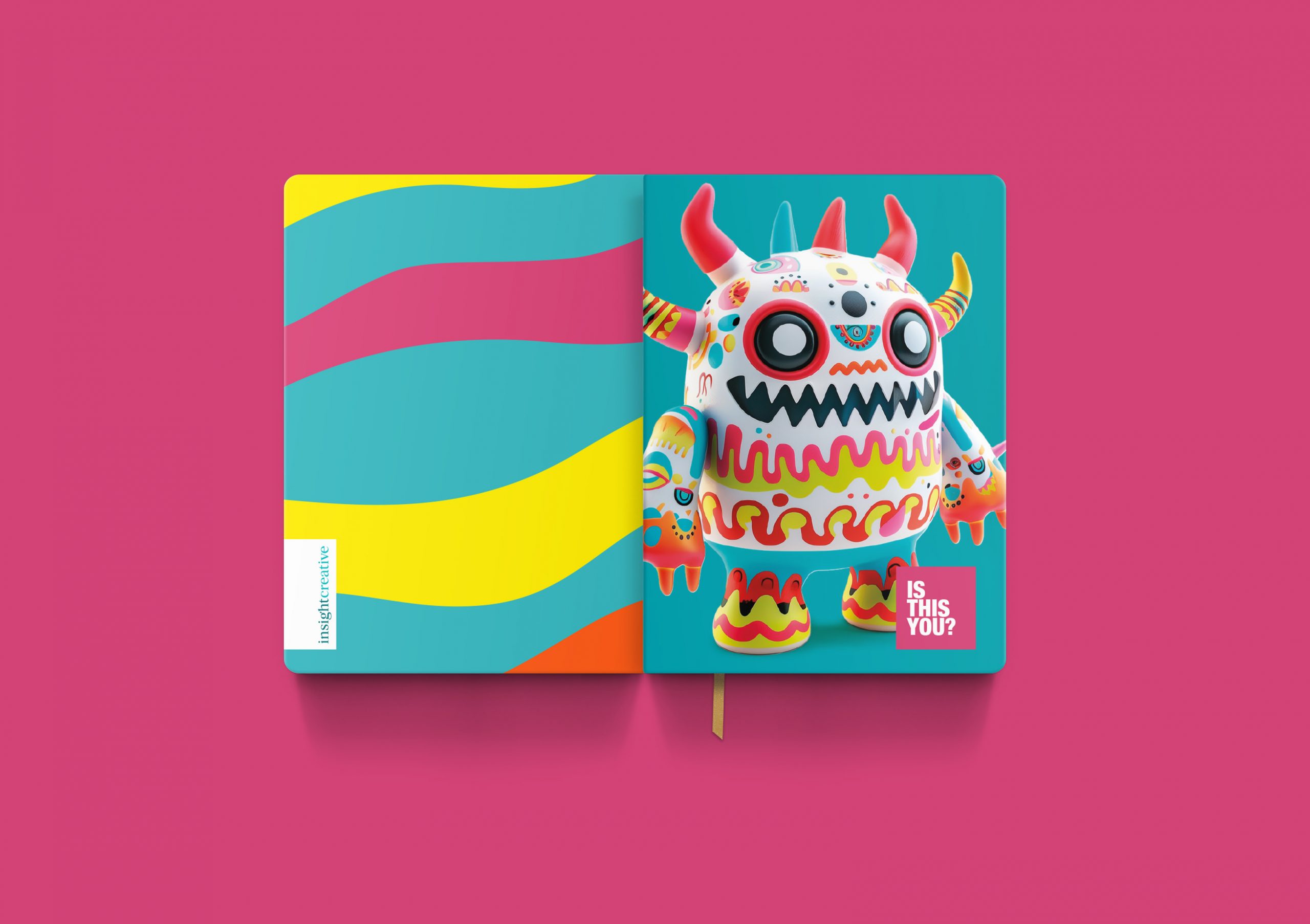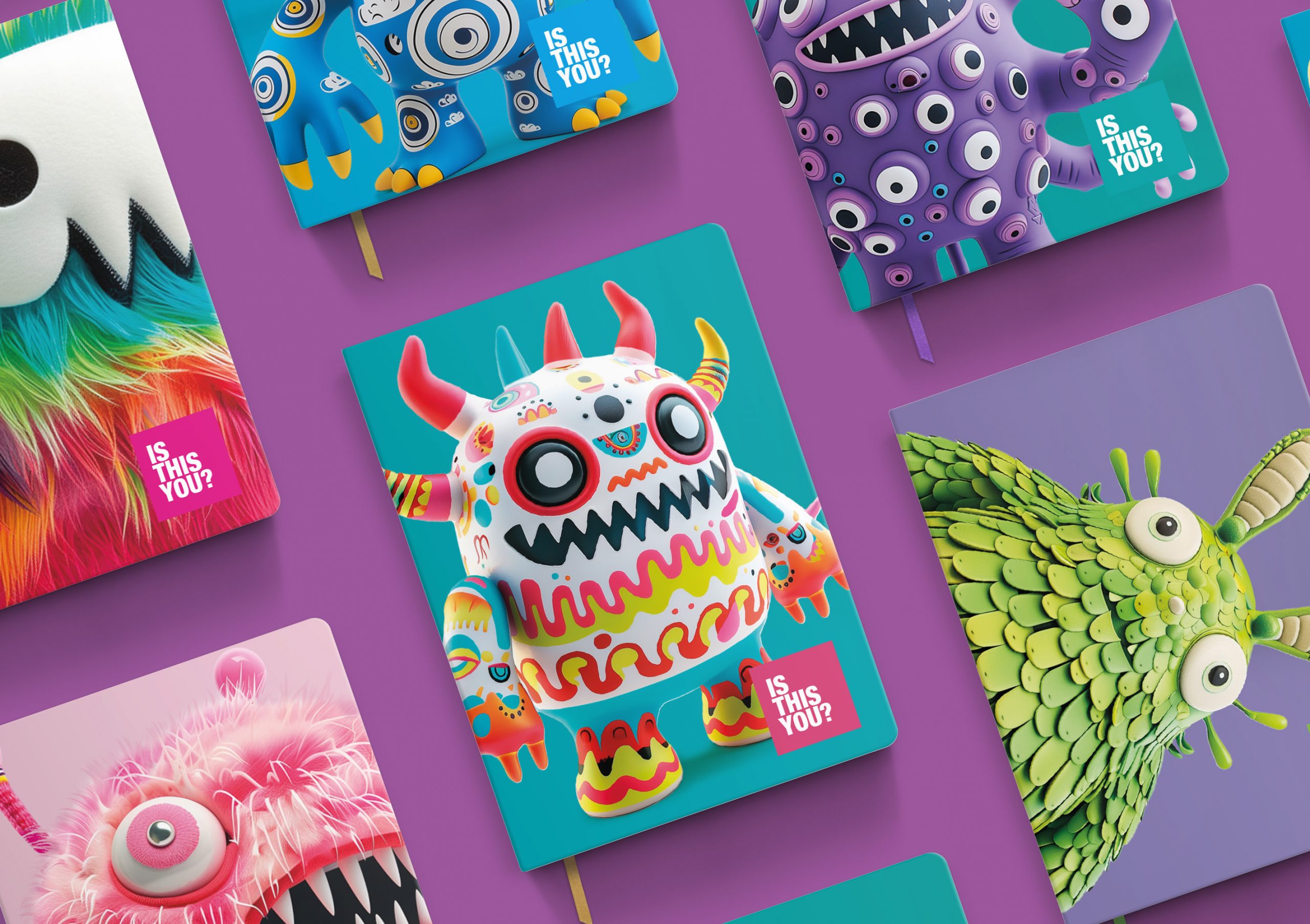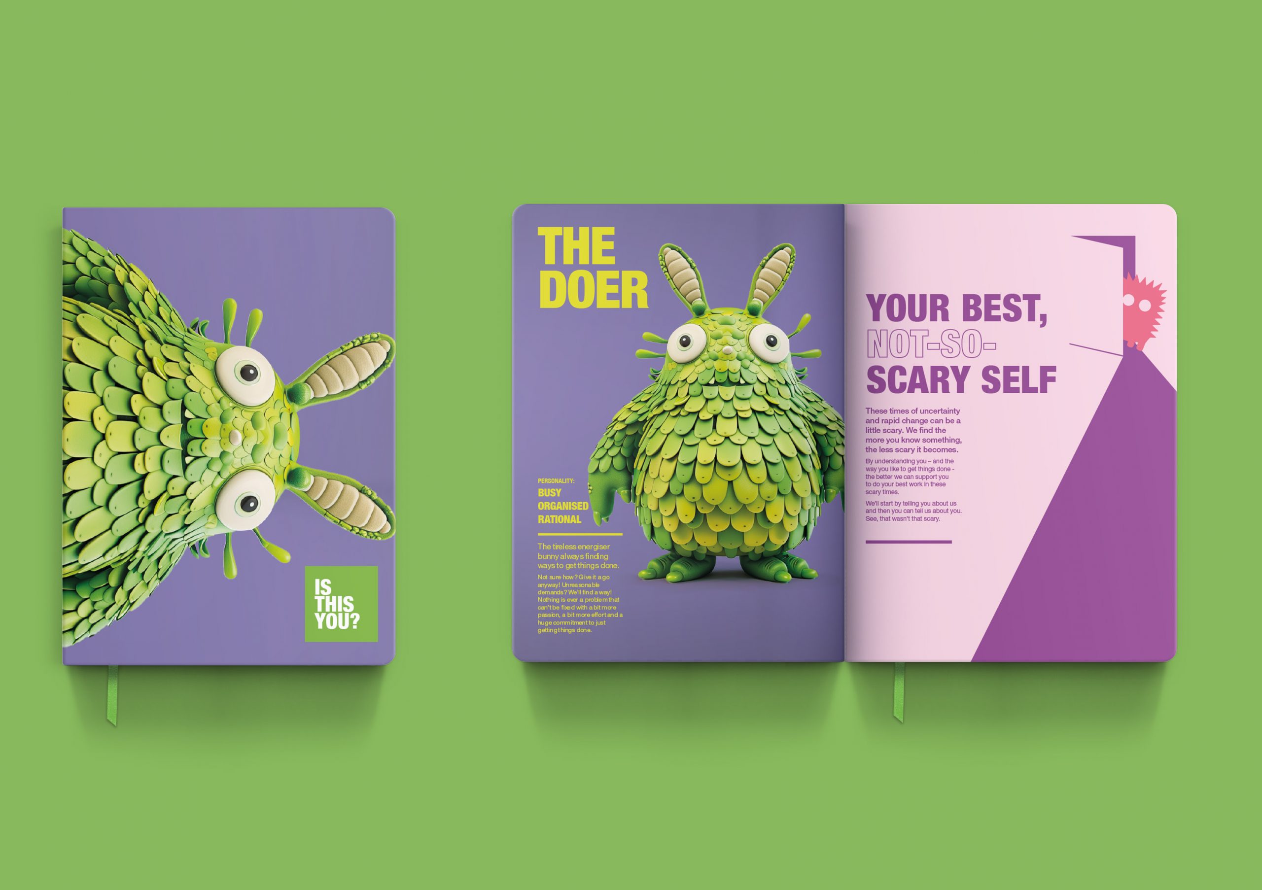 Using MidJourney and Photoshop, we crafted vibrant, tactile, 3D-inspired monsters with distinct colour palettes and creative auras. They helped express a key insight: the more you understand something, the less scary it becomes. These characters were applied across strategy comms—from presentations to posters, notebooks, and internal merch.