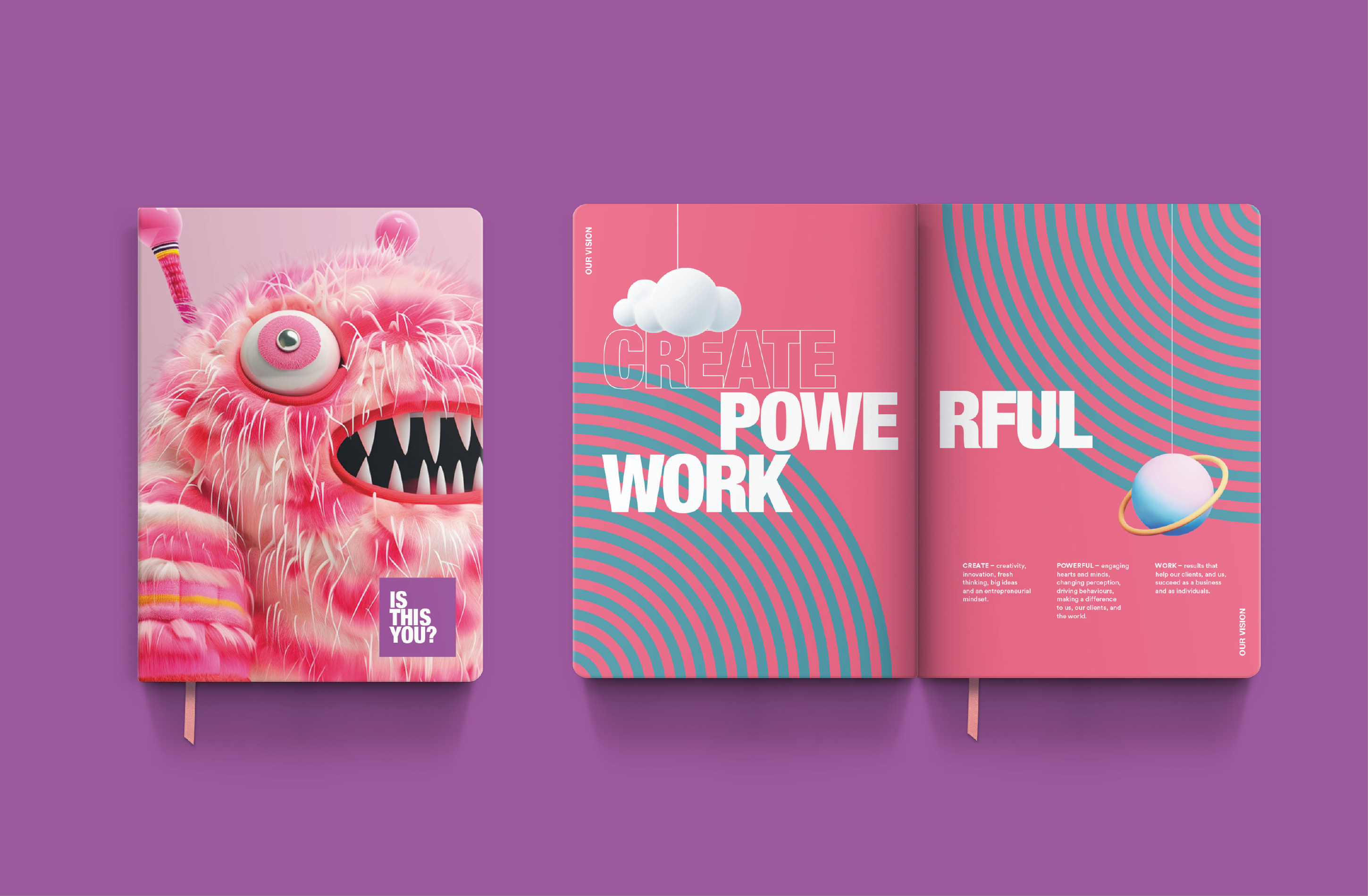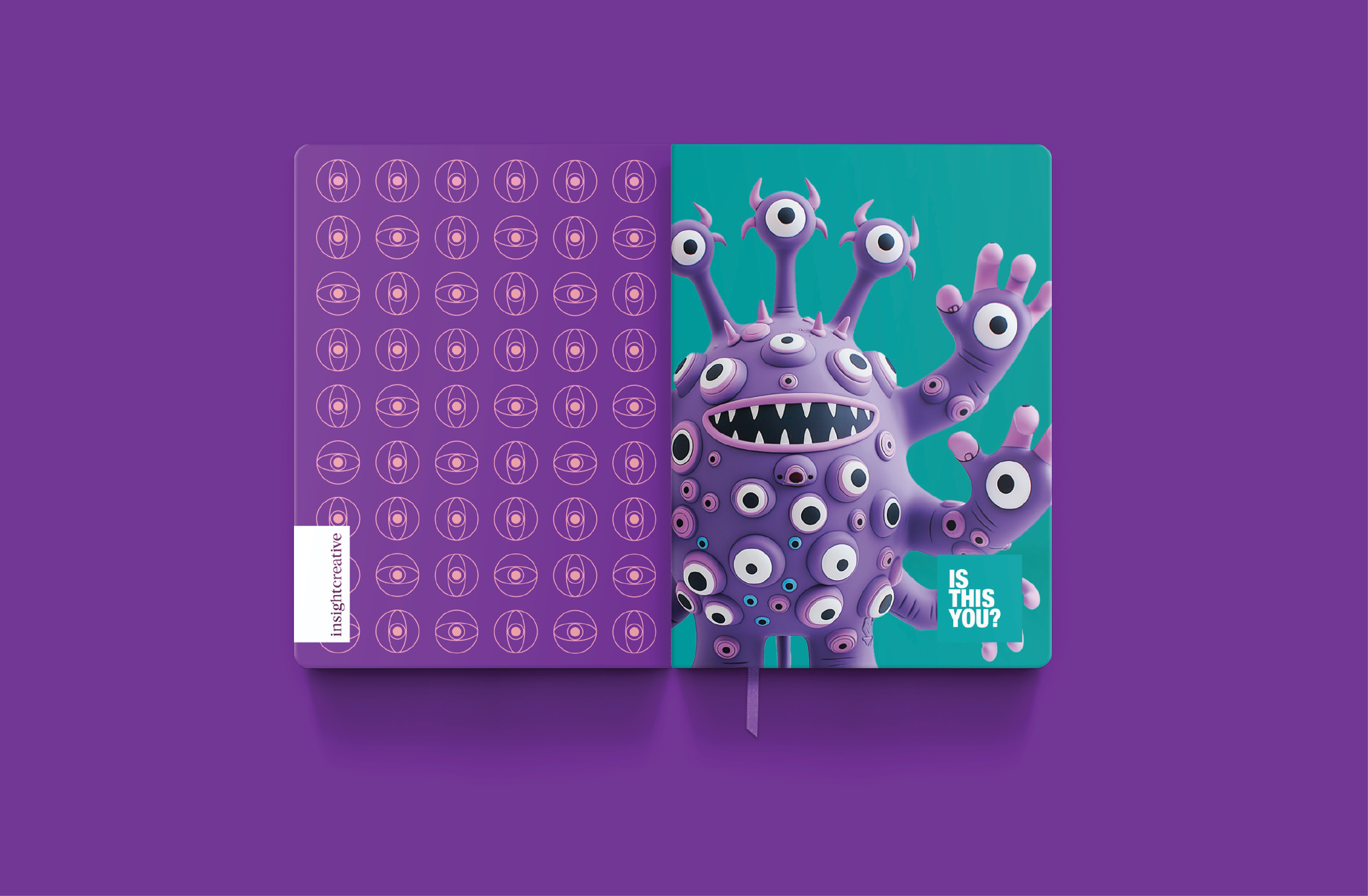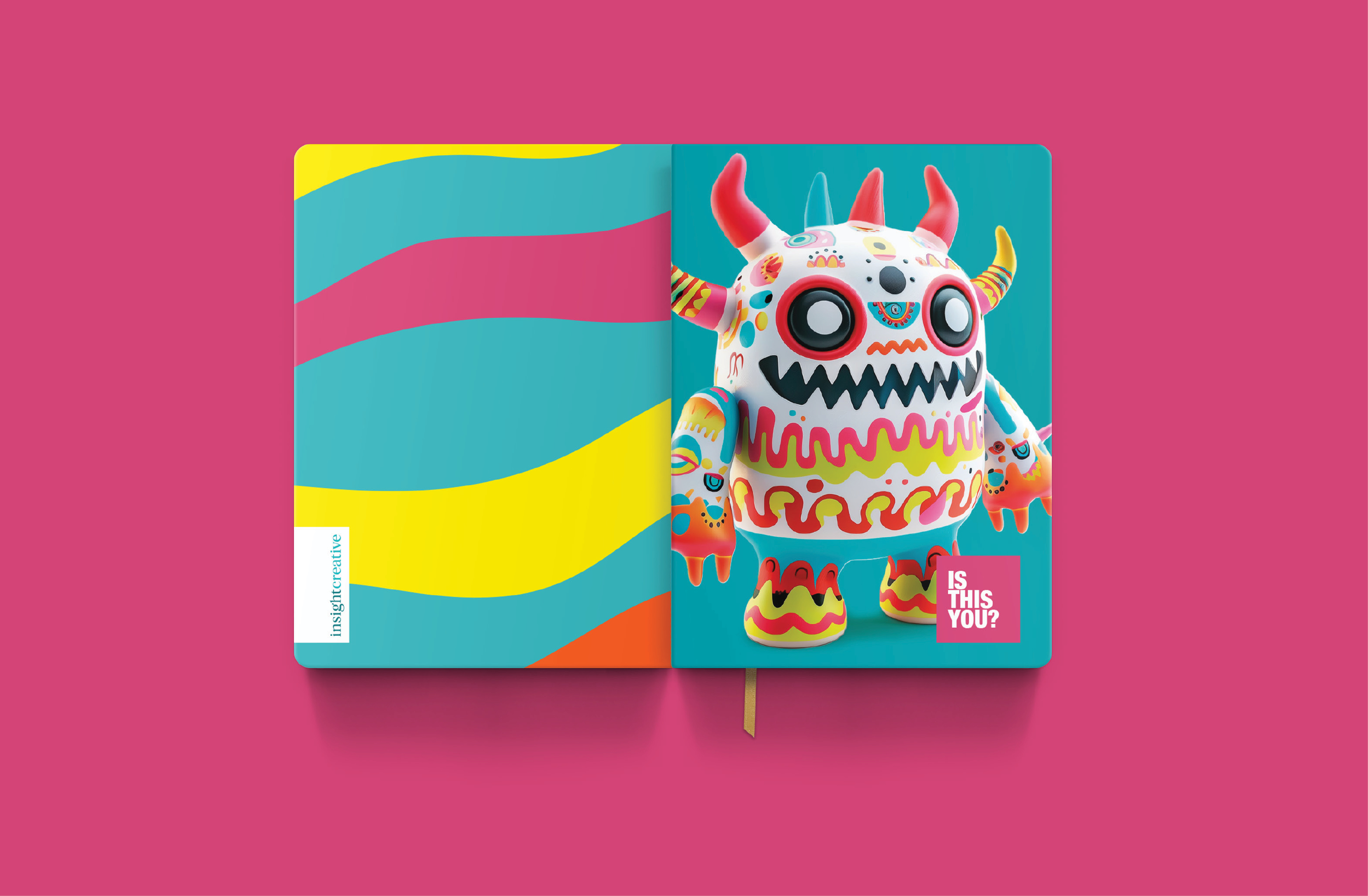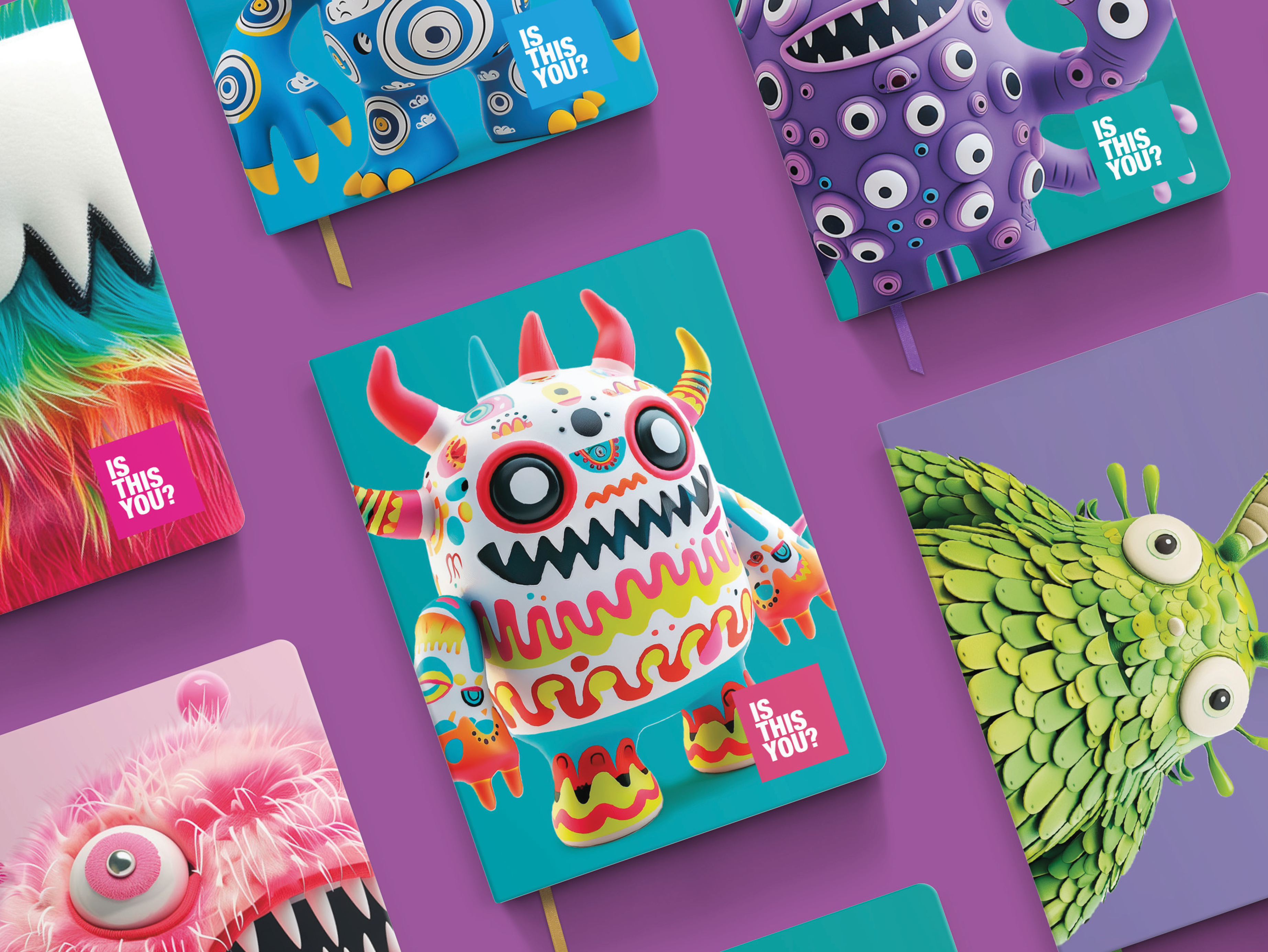 Using MidJourney and Photoshop, we crafted vibrant, tactile, 3D-inspired monsters with distinct colour palettes and creative auras. They helped express a key insight: the more you understand something, the less scary it becomes. These characters were applied across strategy comms—from presentations to posters, notebooks, and internal merch.